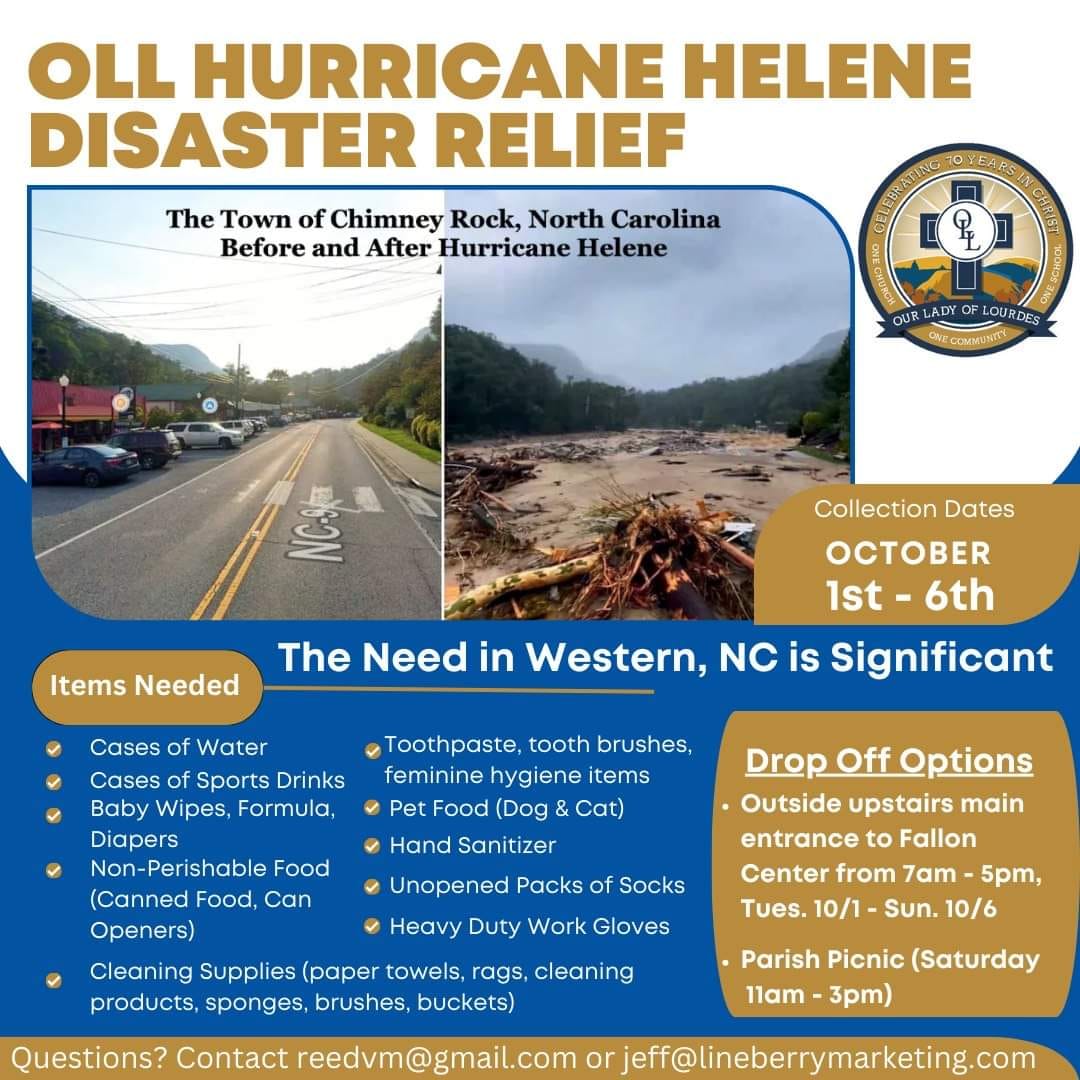 Our WGK Reed and Brother Jeff deserve a special thanks for taking the initiative to rally the entire parish to hold a drive for those in Western NC devastated by Hurricane Helene. Thanks to all the other Knights that assisted in this effort. Almost 3 truck loads were donated. Please consider donating to the Red Cross or any other reputable organization to assist with this long recovery.