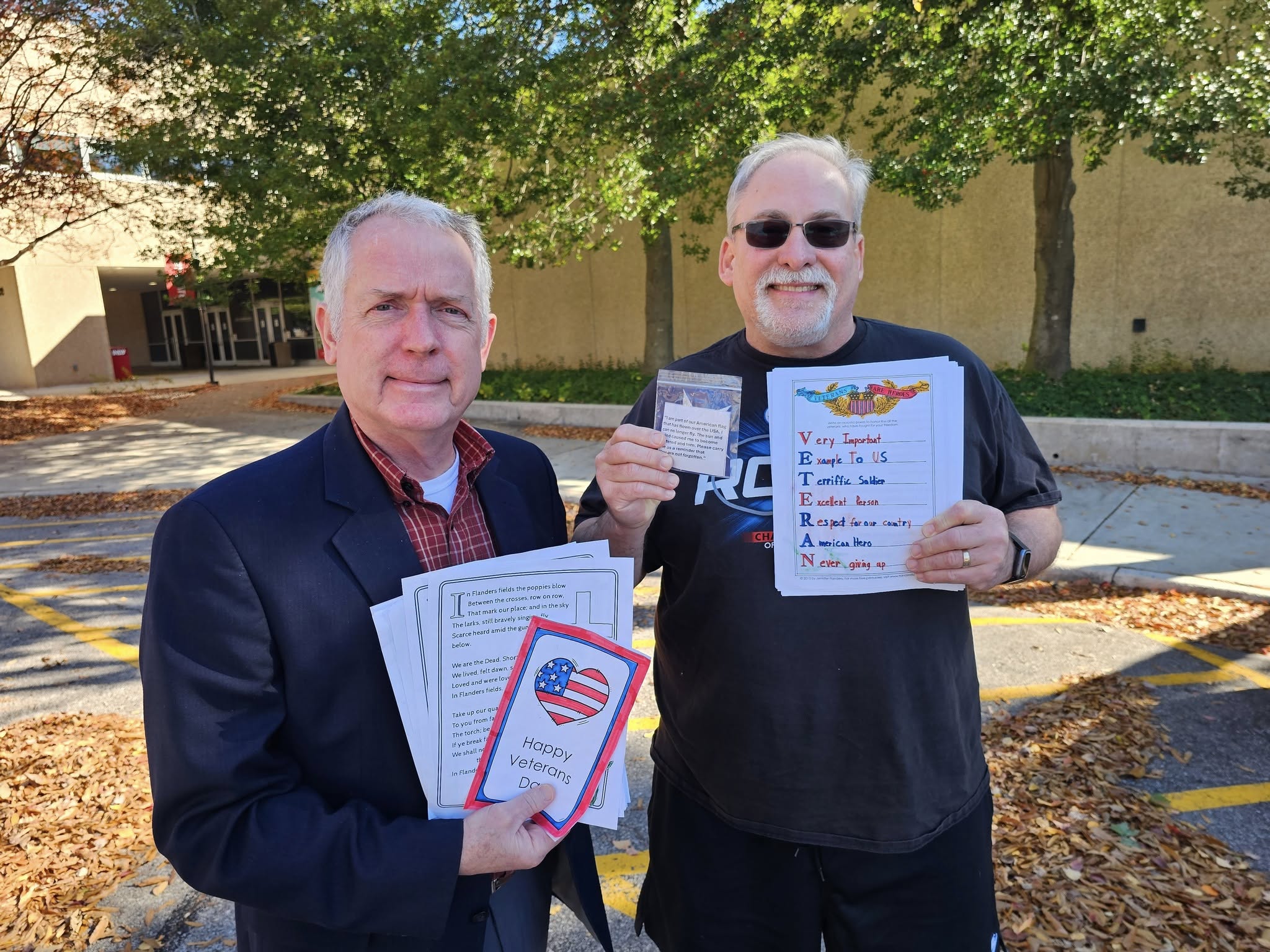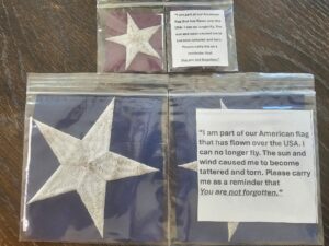 Today I met with our worthy GK- a veteran, to deliver these small tokens of appreciation from the Knights. He delivered them to many of our veterans being treated at the VA hospital in Durham. Students from Our Lady of Lourdes School created beautiful cards to deliver as well. The message reads “I am part of our American flag that has flown over the USA. I can no longer fly. The sun and wind caused me to become tattered and torn. Please carry me as a reminder that You are not forgotten.” Thanks to Matthew Handley and ALL the brave men and women who have served this great nation. God bless you!